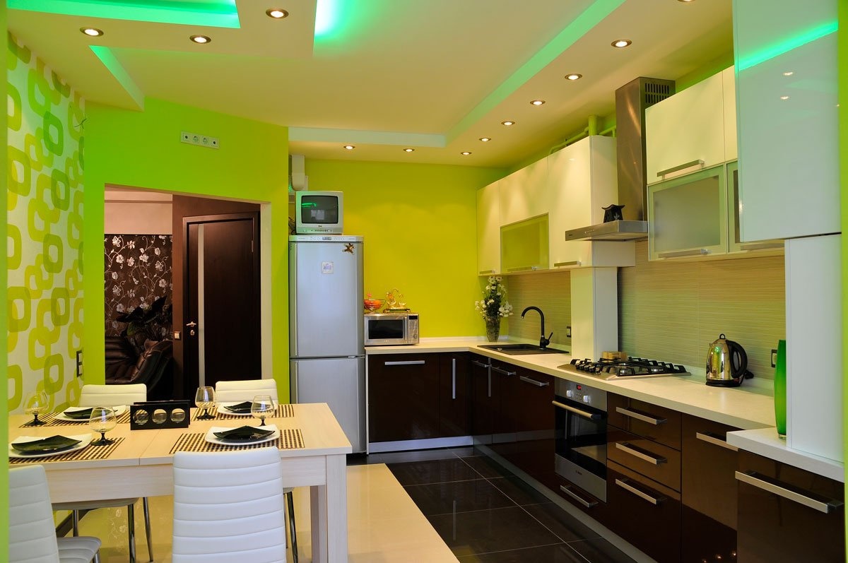 Однако при использовании глянцевых красок на потолке следует соблюдать осторожность. Вам следует избегать угловых люстр - сильно отражающие эмульсии могут показать не слишком привлекательные "внутренности" лампы. Выбирайте плоские светильники или красивые оттенки.